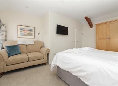 Bedroom 1: King size bed, wardrobe, chest of drawers, bedside cabinets and a sofa with sea views.