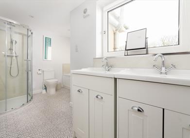 Family Bathroom: Bath, shower, WC, two wash hand basins and heated towel rail.