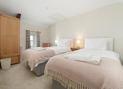 Bedroom 2: Twin beds that can be configured as a super king upon request, wardrobe, bedside cabinets and a chair with sea views.