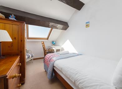 Bedroom 4: Single bed, chest of drawers, wardrobe, small desk and extensive sea views from the large Velux window.