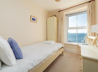 Bedroom 3: Single bed, bedside table, chest of drawers, wardrobe and extensive sea views.