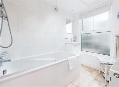 Family bathroom: Shower over bath and wash hand basin, with WC separate.