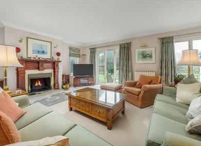 Living room: Two comfortable sofas with ample space, one armchair, TV, coffee table, log burner.