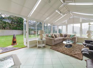 Conservatory: Large L-shaped sofa, two swivel chairs and access to the garden.
