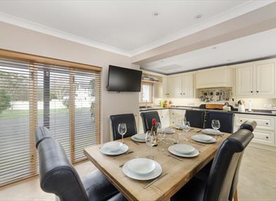 Kitchen: Well-equipped containing oven, hob, toaster, kettle, dishwasher, fridge/freezer. Dining table with 8 seats.