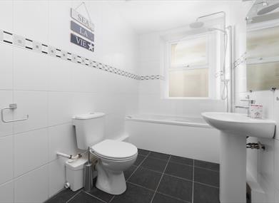 Family bathroom: Bath with shower over, wash hand basin and WC