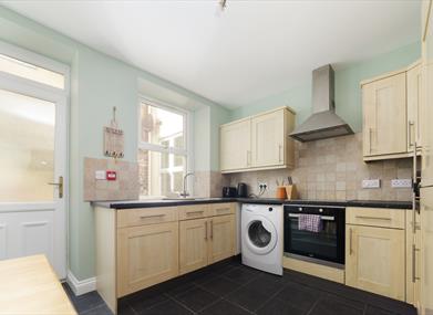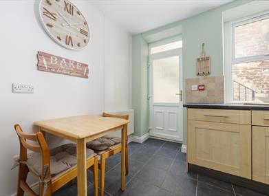 Kitchen: Oven, hob, fridge, freezer, dishwasher, microwave, small table with seating for 2