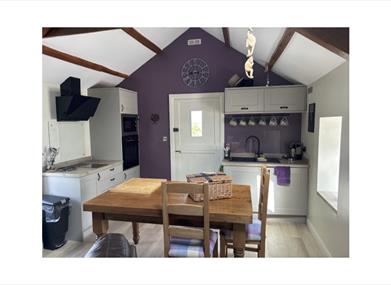 Upper floor: has a fully fitted kitchen / diner with microwave, oven, two ring induction hob, air fryer, extractor fan, fridge, kettle, crockery, cutlery, dining table and plenty of cupboard space. A quaint stable door leads off the kitchen to the outside steps.