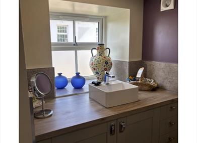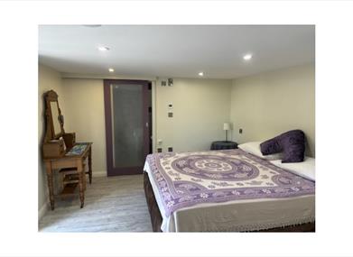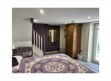Ground floor: a large bedroom with a super king sized bed, or it can be set up as a twin room. There is a dressing table, bedside table and a wardrobe. An en-suite shower room with a large electric shower, toilet, wash basin, heated towel rail and washing machine. An Iron / ironing board / hairdryer are available and washing can be tumble dried on request. There is underfloor heating throughout the lower floor