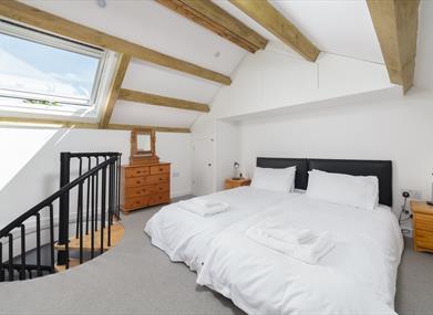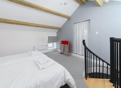 Narrow spiral staircase leading to bedroom: This property can be set up as a superking size double or twin beds. Bedside lamps, radiator, Velux black out blind.