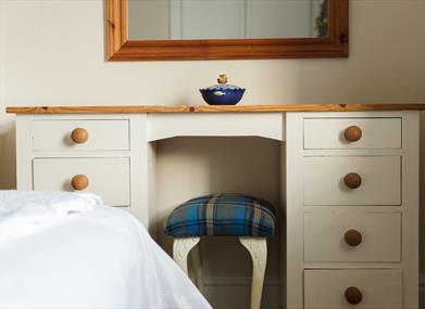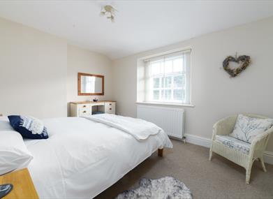 Bedroom 2: Double bed, bedside table & lamp, wardrobe and small dressing table.