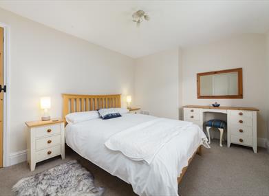 Bedroom 1: Double bed, bedside tables & lamps, built-in wardrobe, chest drawers, radio and dressing table.