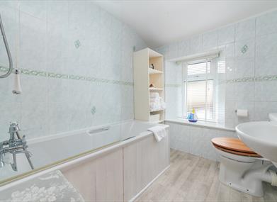 Bathroom: Electric shower over bath, WC and hand wash basin.