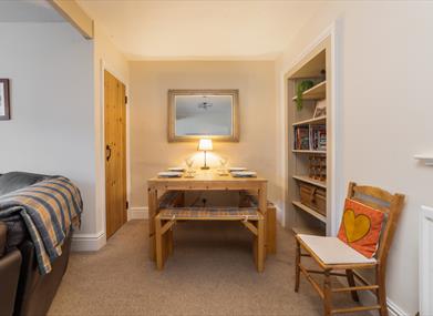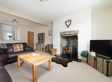 Lounge & Dining area: Log burner, one large L-shaped sofas, TV and dining table to seat four.