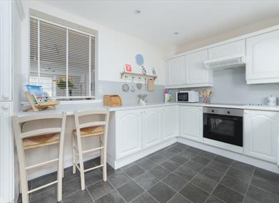 Kitchen: Well-equipped kitchen, including hob, fridge, freezer, oven, microwave, washer/dryer and breakfast bar with two stools.