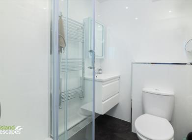 Family Bathroom: Walk in shower, WC and wash hand basin.