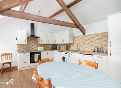 Kitchen/Dining area: Electric oven, hob, fridge, freezer, dishwasher, microwave, washing machine/dryer, dining table and 4 chairs.