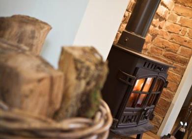 Kitchen & Lounge: Open plan area, two sofas, dining table with four chairs, TV, coffee table and log burning stove.