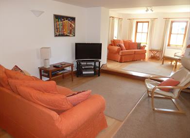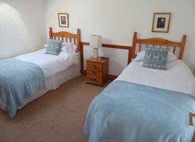 Upstairs there are two bedrooms, one with king size bed, the other with two singles. Both bedrooms have en-suite facilities and flatscreen TV.