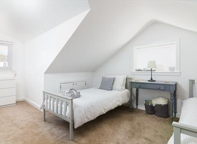 Bedroom 4: Twin beds, bedside table, chest of drawers, wardrobe