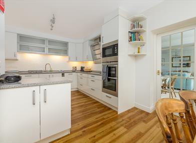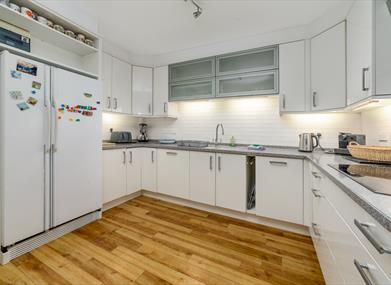 Kitchen: Well equipped, containing microwave, large American style fridge/freezer, dishwasher, double oven and table and six chairs.