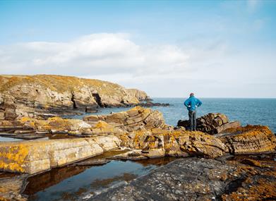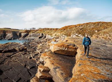 The beach is a secluded little cove with a mixture of sand, shingle and rocks, and the cove is flanked on either side by cliffs backed with grassland, shrubs and gentle rolling hills. At low tide there are a number of rockpools exposed.