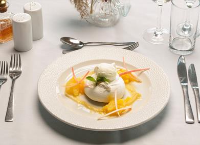 A beautifully balanced dessert with crisp and chewy pavlova, made with Gellings eggs from Baldrine, is topped with tangy rhubarb and silky-smooth custard, finished with a scoop of rich, homemade ice cream made with creamy milk from Isle of Man Creamery. A nostalgic classic with a local twist.