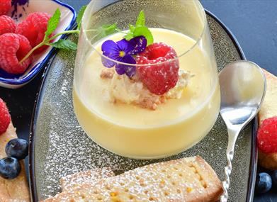 A beautifully light and creamy dessert made with the Island's finest cream, locally made RNLI Fynoderee gin and a squeeze of lime, topped with whipped Manx cream and local berries. Served with our delicious homemade shortbread on the side.