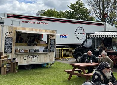 Our homemade Manx beef burger, topped with slow cooked Manx beef and streaky bacon, Manx cheddar and American cheese, served in a Ross Bakery sesame seed bun with lettuce, sliced vine tomatoes, homemade onion chutney and our Manx honey and sriracha sauce. Served with our handcut chips sourced from Peel Fisheries.