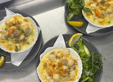 Living on the Island - especially in Peel - this dish is inspired by the abundance of beautiful local shellfish that is right on our doorstep! Locally caught Manx King scallops, crab & lobster cooked in a creamy white wine sauce, topped with Manx cheddar and breadcrumbs.