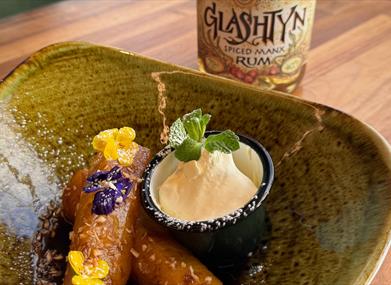 Glashtyn Manx spiced rum poached pineapple, salted caramel cream, toasted coconut.
