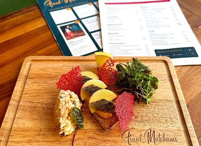 Fynoderee winter gin and beetroot cured salmon, potted prawns, crab crostini, Queenie Thermidor, toasted Noa’s bread and micro leaves.