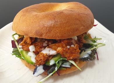 Inside a Ross Bakery bagel our creation meets a homemade hot sauce, featuring local ingredients such as Fire Island cayenne chilli, Isle of Cider vinegar and Leela's Kitchen spices.
