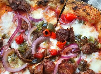 Red Mie Loaghtan Lamb, slow roast with a blend of Middle Eastern Spices, on a slightly spiced tomato sauce, Mozzarella, Roquito Peppers using Fire Island Chillis, Marinated Red Onion from Robinsons, Pomegranate and a Garlic and Chilli Tahini Sauce using Chilli's from Fire Island.