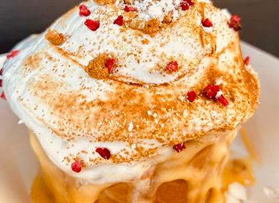 Drenched in hot vanilla custard, each spoonful is a silky, warming embrace, while the addition of homemade frozen custard gelato made with the finest Manx milk and cream, adds a cool, velvety balance. To finish, a bomb of torched homemade marshmallow, whipped from local Gellings eggs melts into the dish, offering a delicate, toasted sweetness.