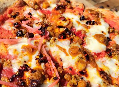 Neapolitan Pizza made with Manx flour, Topped with homemade Fennel Sausage using meat from Andreas Meat, Red Onion from Ballapdag, N'duja, Chorizo from Manx Laoghtan produce finished with a hot honey made from local honey. Allergens - Wheat, Gluten