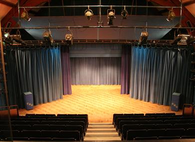 10 lanterns on 1 barrel facing stage area, 6 lanterns on 2 barrels at side of stage area, 2 spots above stage area. Strand lighting 200 desk. 13A sockets stage left and right.