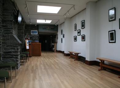 The Gallery comprises an exhibition space of 17m x 3m, giving 17m of wall hanging area to a height of 2.5m. Alternatively, this area can sit up to 50 people. Lighting is on fully adjustable, overhead tracks and we have steel rod, hanging facilities for the installation of 2D wall mounted work. There is also a shop for the display and sale of merchandise.