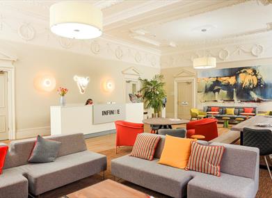 This is a versatile room and can be used for a variety of functions, presentations, think-tanks, training; workshops and networking sessions or meetings. It can comfortably seat 60 guests for a presentation. Alongside this, the reception area can be used to serve lunches or refreshments next to our warm cosy fireplace in the winter months.