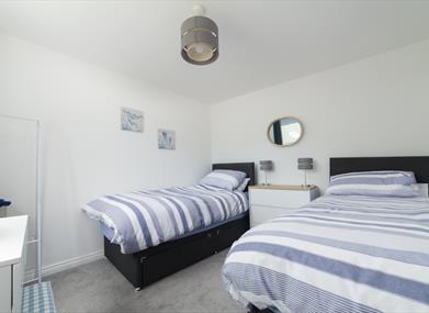 Bedroom: Twin beds, bedside cabinets, dressing table and hanging space