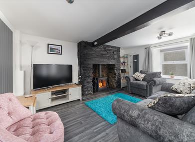 Lounge: Comfortable sofa and two chairs providing ample seating for 4, log burner and large TV. Please be cautious around the log burner with children when lit.