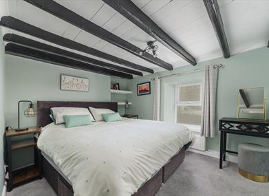 The downstairs area contains a living room and kitchen, a lovely and cosy setting with an exposed fireplace and log burner. The modern kitchen is well-appointed and provides all you need for a holiday. The master bedroom in the property mixes modern comfort with traditional features, such as the wooden beams running across the ceiling! The second bedroom contains two single beds, making the property perfect for a small family.