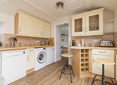 The ground floor has a lounge with a large TV. Free WiFi. The dining room table seats 8 but can be extended to 12 if entertaining . The dining room leads into a separate fully fitted kitchen with new white goods including Bosch washing machine and dishwasher. The kitchen features a new double electric oven and electric hob. The kitchen leads into a lovely yard with tables and chairs and benefits from the sun. The house has its own off road parking behind metal gates that would suit several motorbikes and a small car. Next to the house is a free small car park. 4 Shore Road is approximately 20 yards from the beach which is accessed by zebra crossing over the promenade. Pubs, restaurants and the high street are very close and only a few minutes walk.