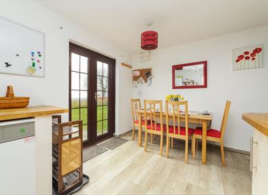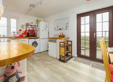 Kitchen / Dining area: Well-equipped, including hob, oven, washing / dryer, fridge / freezer and microwave. Dining table with four chairs is in the dining area, with views out of the French doors