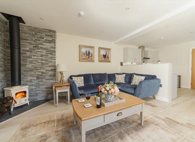 Lounge/Dining area: Log burner, corner sofa, coffee table, smart TV, Dining table with four chairs