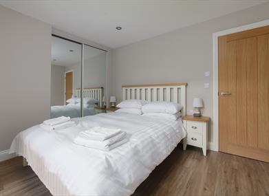Bedroom 1: King size double bed, built in wardrobe, bedside tables, dressing table, hairdryer, mirror and stool