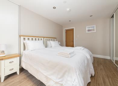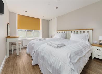 Bedroom 2: Twin beds, built in wardrobes, bedside tables, dressing table, hairdryer, mirror and stool
