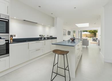 A spacious open plan ground floor area features a classy dining area which flows through into the kitchen, containing a large island which acts as a focal point for the space. Beyond the kitchen is the statement living area, with bi-folding doors accessing the patio and landscaped garden, providing a wonderful space for the whole group to socialise. The addition of the skylight creates a light and airy space.