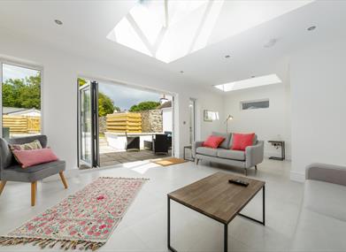 Living Area: Two comfortable sofas and two armchairs to seat 8 people, Smart TV and bi-fold door access to landscaped garden and patio.
