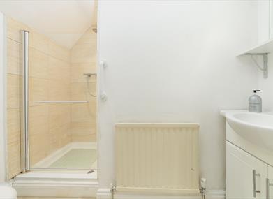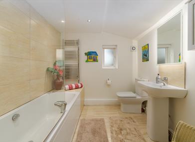 Bathroom: Shower over bath, with handheld shower, WC, basin.